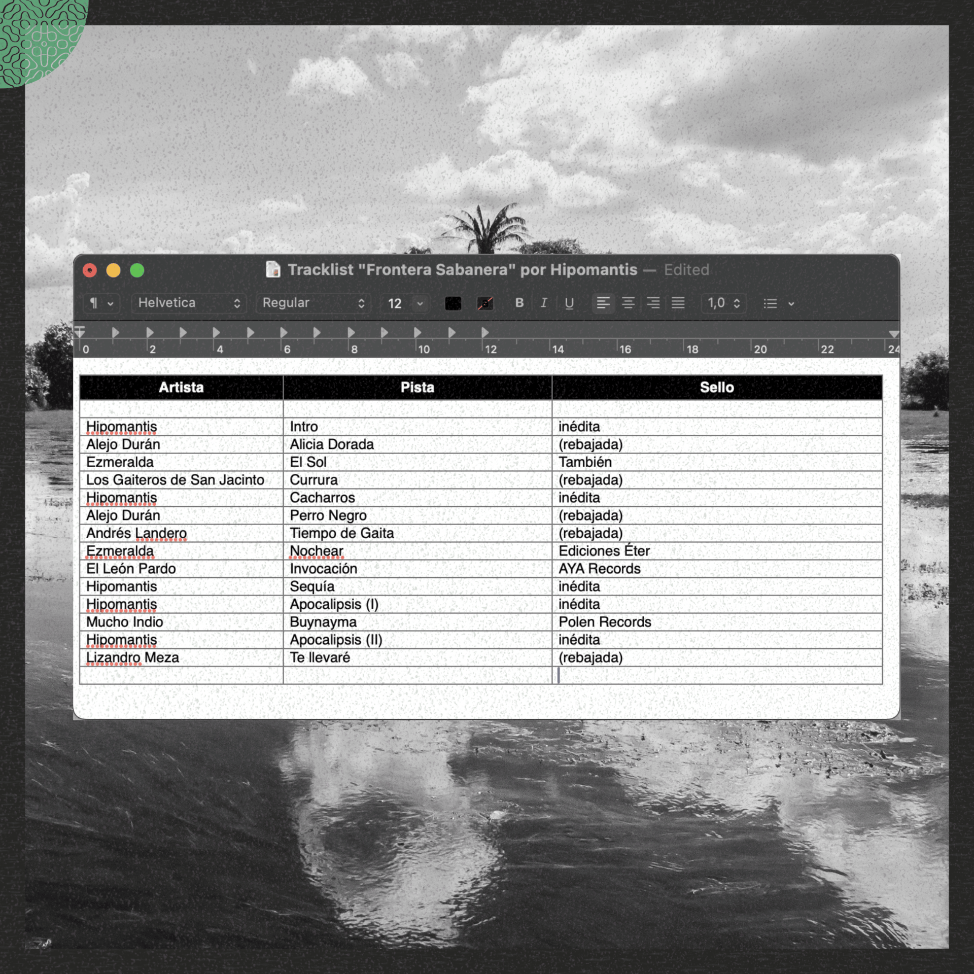 Es muy emocionante poder compartir un mixtape tan auténtico y claro en su intención, ademas de que cuenta con varias pistas inéditas. Con “Frontera Sabanera”, Hipomantis logra someternos a una sensación de calor pegachento y sofocante, con una sed inescapable. Sentimos el brotar de nuestras venas que parecen alcanzar su punto de ebullición, y con este, el evaporar de nuestra existencia.